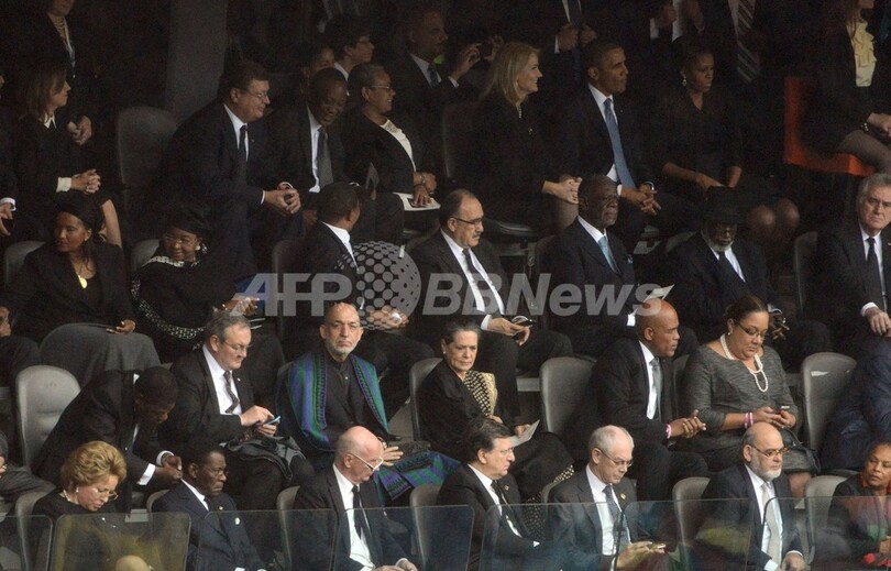 【12月11日 AFP】米国のバラク・オバマ(Barack Obama)大統領は10日、南アフリカのソウェト(Soweto)で執り行われたネルソン・マンデラ(Nelson Mandela)元大統領の追悼式に出席し、多数の参列者の心を揺り動かす弔辞を述べたが、同日ソーシャルネットワークをにぎわせたのは、オバマ氏がデンマーク、英国の首相と笑顔で撮った「セルフィー(自分撮り写真)」だった――。