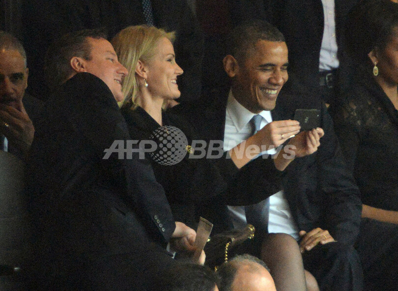 【12月11日 AFP】米国のバラク・オバマ(Barack Obama)大統領は10日、南アフリカのソウェト(Soweto)で執り行われたネルソン・マンデラ(Nelson Mandela)元大統領の追悼式に出席し、多数の参列者の心を揺り動かす弔辞を述べたが、同日ソーシャルネットワークをにぎわせたのは、オバマ氏がデンマーク、英国の首相と笑顔で撮った「セルフィー(自分撮り写真)」だった――。