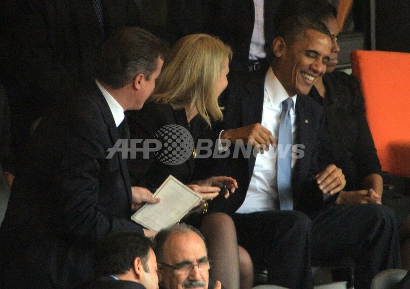 【12月11日 AFP】米国のバラク・オバマ(Barack Obama)大統領は10日、南アフリカのソウェト(Soweto)で執り行われたネルソン・マンデラ(Nelson Mandela)元大統領の追悼式に出席し、多数の参列者の心を揺り動かす弔辞を述べたが、同日ソーシャルネットワークをにぎわせたのは、オバマ氏がデンマーク、英国の首相と笑顔で撮った「セルフィー(自分撮り写真)」だった――。