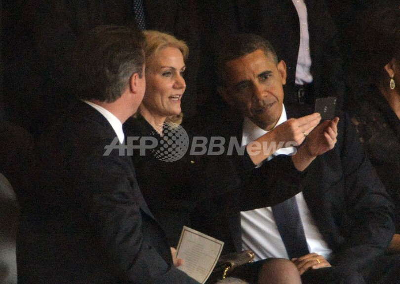 【12月11日 AFP】米国のバラク・オバマ(Barack Obama)大統領は10日、南アフリカのソウェト(Soweto)で執り行われたネルソン・マンデラ(Nelson Mandela)元大統領の追悼式に出席し、多数の参列者の心を揺り動かす弔辞を述べたが、同日ソーシャルネットワークをにぎわせたのは、オバマ氏がデンマーク、英国の首相と笑顔で撮った「セルフィー(自分撮り写真)」だった――。