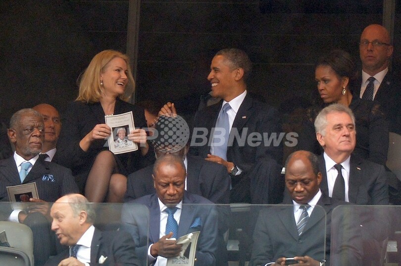 【12月11日 AFP】米国のバラク・オバマ(Barack Obama)大統領は10日、南アフリカのソウェト(Soweto)で執り行われたネルソン・マンデラ(Nelson Mandela)元大統領の追悼式に出席し、多数の参列者の心を揺り動かす弔辞を述べたが、同日ソーシャルネットワークをにぎわせたのは、オバマ氏がデンマーク、英国の首相と笑顔で撮った「セルフィー(自分撮り写真)」だった――。