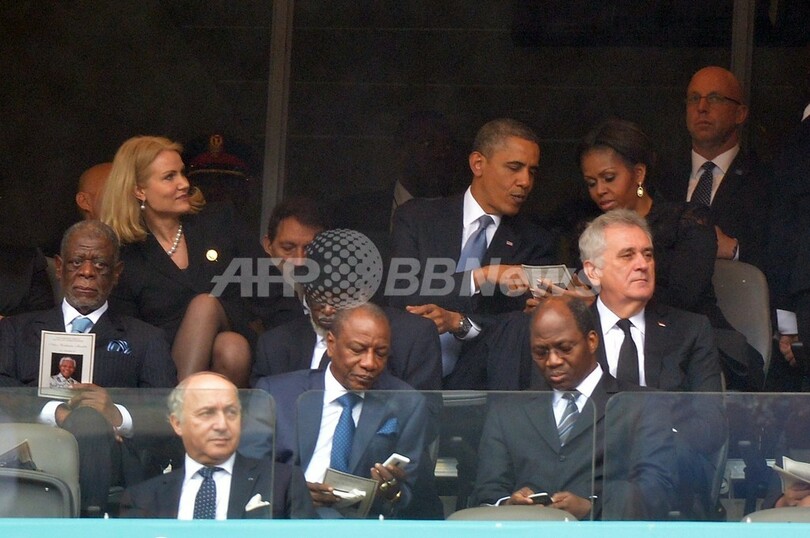 【12月11日 AFP】米国のバラク・オバマ(Barack Obama)大統領は10日、南アフリカのソウェト(Soweto)で執り行われたネルソン・マンデラ(Nelson Mandela)元大統領の追悼式に出席し、多数の参列者の心を揺り動かす弔辞を述べたが、同日ソーシャルネットワークをにぎわせたのは、オバマ氏がデンマーク、英国の首相と笑顔で撮った「セルフィー(自分撮り写真)」だった――。