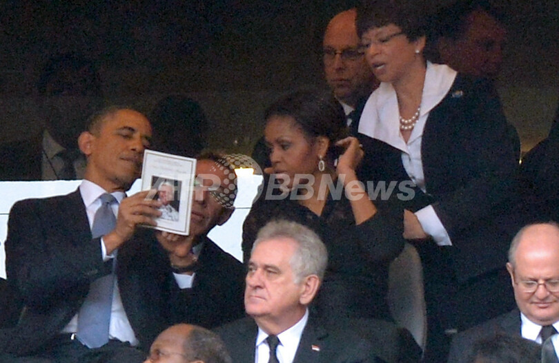 これとは対照的に、オバマ氏の左横に座るミシェル・オバマ(Michelle Obama)米大統領夫人は打ち解けた様子の3首脳には加わらず、5日に95歳で死去した南アフリカの反アパルトヘイトの英雄であるマンデラ元大統領に対し世界の指導者らが追悼の言葉を捧げる演壇の方をじっと見つめていた。