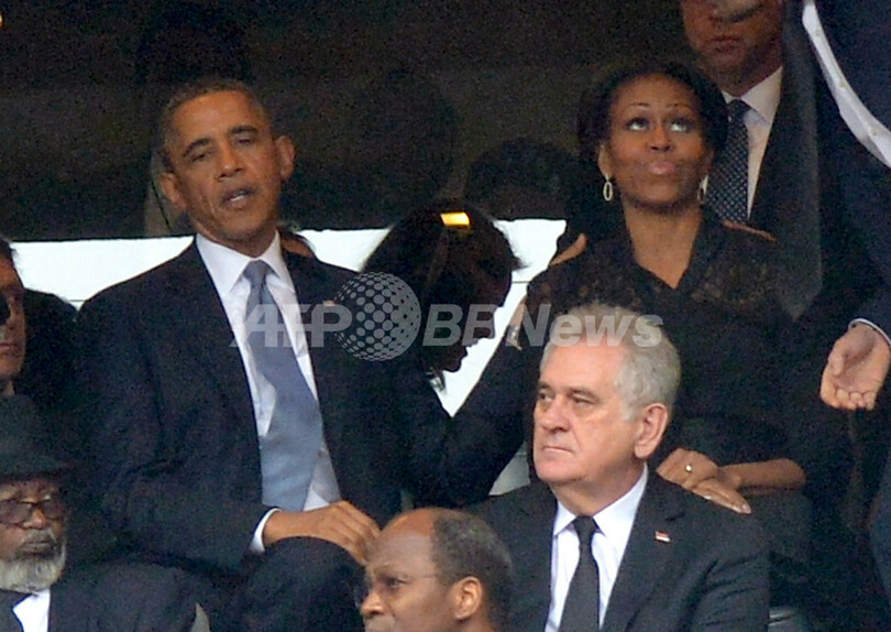 これとは対照的に、オバマ氏の左横に座るミシェル・オバマ(Michelle Obama)米大統領夫人は打ち解けた様子の3首脳には加わらず、5日に95歳で死去した南アフリカの反アパルトヘイトの英雄であるマンデラ元大統領に対し世界の指導者らが追悼の言葉を捧げる演壇の方をじっと見つめていた。