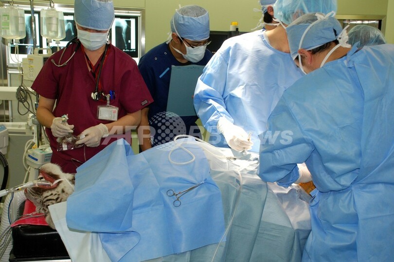 【12月13日 AFP】神奈川県藤沢市の日本大学(Nihon University)生物資源科学部(College of Bioresource Sciences)で10日、世界でも珍しいホワイトタイガー(白変種のベンガルトラ)の後ろ右膝の手術が行われた。手術を受けたのは、埼玉県の東武動物公園(Tobu Zoo)で飼育されている生後9か月の雄ライオン「スカイ」で、5時間半におよぶ手術を耐え抜いた。(c)AFP