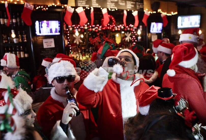 【12月16日 AFP】大勢の人がサンタクロースの仮装で街に繰り出すクリスマスシーズン恒例のイベント「サンタコン(SantaCon)」が週末、英ロンドン(London)や米ニューヨーク(New York)などで開催された。