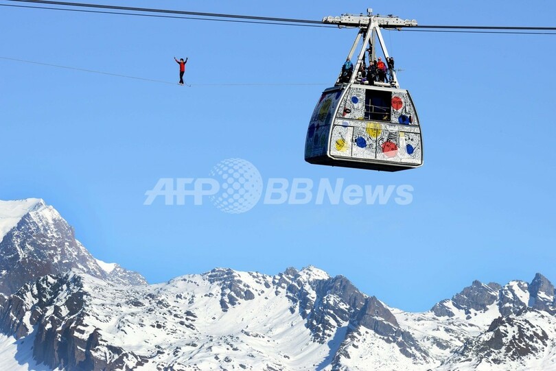 【12月17日 AFP】アルプス山脈の西欧最高峰モンブラン(Mont Blanc)に近い仏ラプラーニュ(La Plagne)、パラディスキー(Paradiski)のロープウエーで16日、フランスのジュリアン・ミロ(Julien Millot)さんとタンクレード・ムレー(Tancrede Melet)さんが綱渡りのパフォーマンスを披露した。