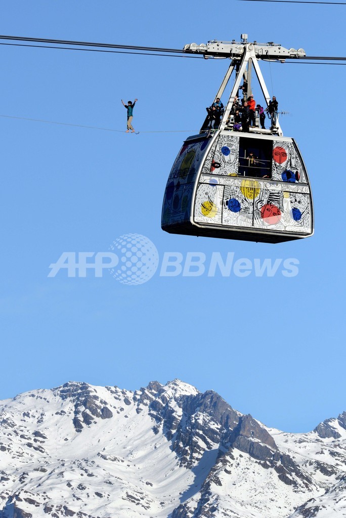 【12月17日 AFP】アルプス山脈の西欧最高峰モンブラン(Mont Blanc)に近い仏ラプラーニュ(La Plagne)、パラディスキー(Paradiski)のロープウエーで16日、フランスのジュリアン・ミロ(Julien Millot)さんとタンクレード・ムレー(Tancrede Melet)さんが綱渡りのパフォーマンスを披露した。