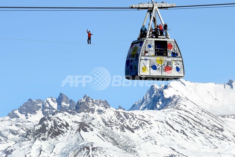 【12月17日 AFP】アルプス山脈の西欧最高峰モンブラン(Mont Blanc)に近い仏ラプラーニュ(La Plagne)、パラディスキー(Paradiski)のロープウエーで16日、フランスのジュリアン・ミロ(Julien Millot)さんとタンクレード・ムレー(Tancrede Melet)さんが綱渡りのパフォーマンスを披露した。