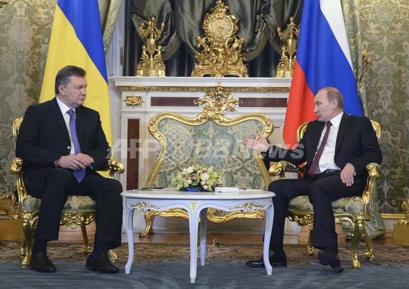 【12月18日 AFP】ロシアのウラジーミル・プーチン(Vladimir Putin)大統領は17日、ロシア・モスクワ(Moscow)のクレムリン(Kremlin)でウクライナのビクトル・ヤヌコビッチ(Viktor Yanukovych)大統領と約3時間にわたって会談した。会談後プーチン大統領はウクライナへの150億ドル(約1兆5400億円)の金融支援と、ロシアからウクライナに輸出する天然ガス価格を約3分の1引き下げると発表した。