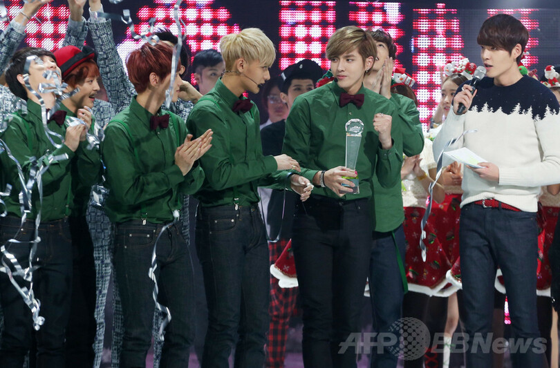 【12月23日 STARNEWS】韓国・ソウル(Seoul)のCJ E&Mセンターで19日、韓国のケーブルテレビ・エムネット(Mnet)の音楽番組「エム・カウントダウン(M countdown)」で、アイドルグループ「EXO(エクソ)」が1位を獲得した。(c)STARNEWS