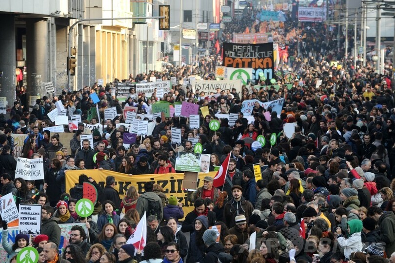 一方、イスタンブール(Istanbul)では同日、内閣総辞職を求める数千人規模の反政府デモ隊が機動隊と衝突した。デモの主な目的は巨大都市開発プロジェクトへの反対だが、靴箱を掲げて閣僚の汚職に怒りを表す参加者もいた。