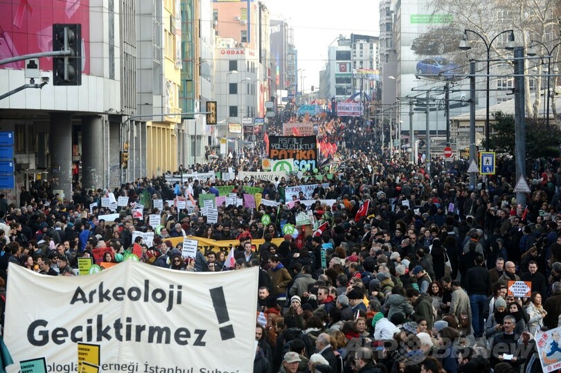 一方、イスタンブール(Istanbul)では同日、内閣総辞職を求める数千人規模の反政府デモ隊が機動隊と衝突した。デモの主な目的は巨大都市開発プロジェクトへの反対だが、靴箱を掲げて閣僚の汚職に怒りを表す参加者もいた。