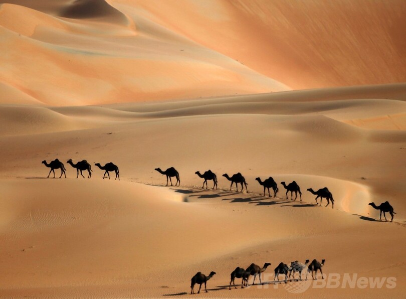【12月23日 AFP】アラブ首長国連邦(UAE)のアブダビ(Abu Dhabi)の西方約220キロに広がるリワ(Liwa)砂漠で22日、赤茶けた砂丘を一列になって進むラクダの群れの姿をAFPのカメラがとらえた。