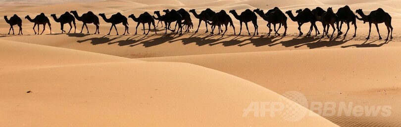 【12月23日 AFP】アラブ首長国連邦(UAE)のアブダビ(Abu Dhabi)の西方約220キロに広がるリワ(Liwa)砂漠で22日、赤茶けた砂丘を一列になって進むラクダの群れの姿をAFPのカメラがとらえた。