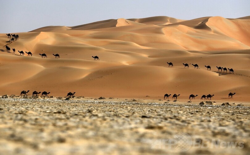 【12月23日 AFP】アラブ首長国連邦(UAE)のアブダビ(Abu Dhabi)の西方約220キロに広がるリワ(Liwa)砂漠で22日、赤茶けた砂丘を一列になって進むラクダの群れの姿をAFPのカメラがとらえた。