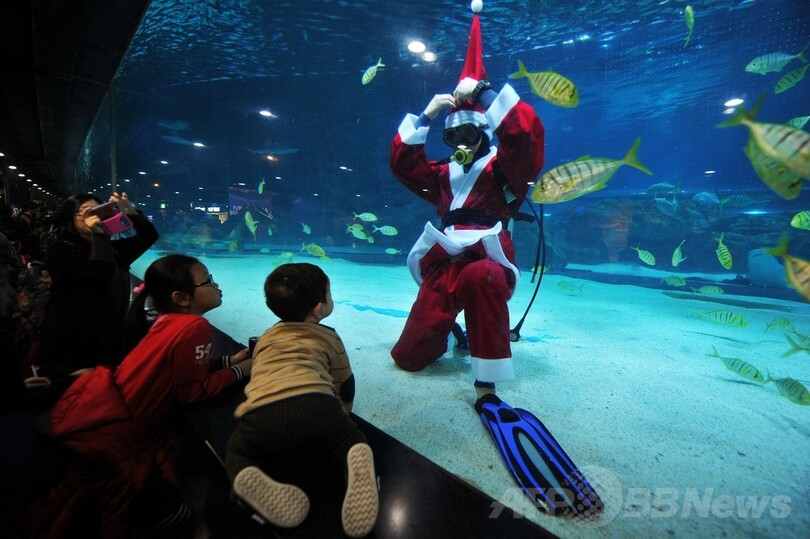 【12月24日 AFP】韓国・ソウル(Seoul)のコエックス・アクアリウム(Coex Aquarium)で20日、サンタクロースの衣装を着たダイバーが水槽に入り、魚たちと泳ぐパフォーマンスを披露した。クリスマスのシーズン中、水族館ではこの他にもさまざまなイベントが開催される。(c)AFP