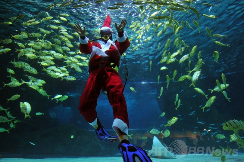 【12月24日 AFP】韓国・ソウル(Seoul)のコエックス・アクアリウム(Coex Aquarium)で20日、サンタクロースの衣装を着たダイバーが水槽に入り、魚たちと泳ぐパフォーマンスを披露した。クリスマスのシーズン中、水族館ではこの他にもさまざまなイベントが開催される。(c)AFP