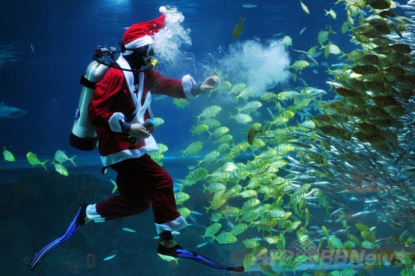 【12月24日 AFP】韓国・ソウル(Seoul)のコエックス・アクアリウム(Coex Aquarium)で20日、サンタクロースの衣装を着たダイバーが水槽に入り、魚たちと泳ぐパフォーマンスを披露した。クリスマスのシーズン中、水族館ではこの他にもさまざまなイベントが開催される。(c)AFP