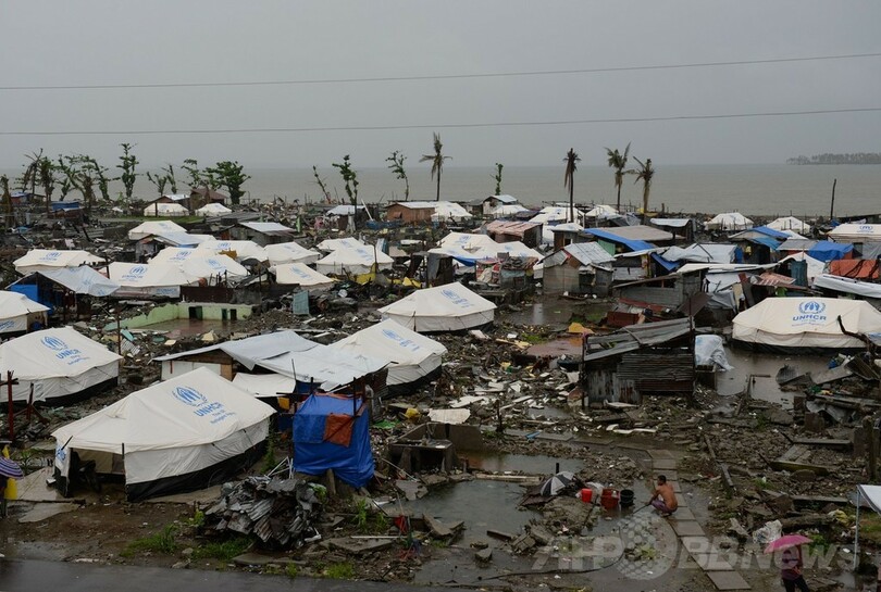 台風30号では6100人が亡くなり、2000人近くが行方不明となった。その多くはタクロバンと周辺地域の人々だ。台風の多いフィリピンでも史上最大規模の被害となった。フィリピン中部の島々では約440万人が家を失い、現在は援助機関などが提供している仮設テントか、壊れた家のがれきや倒れた木を使って自分たちで建てた粗末な小屋に暮らしている。(c)AFP/Cecil Morella
