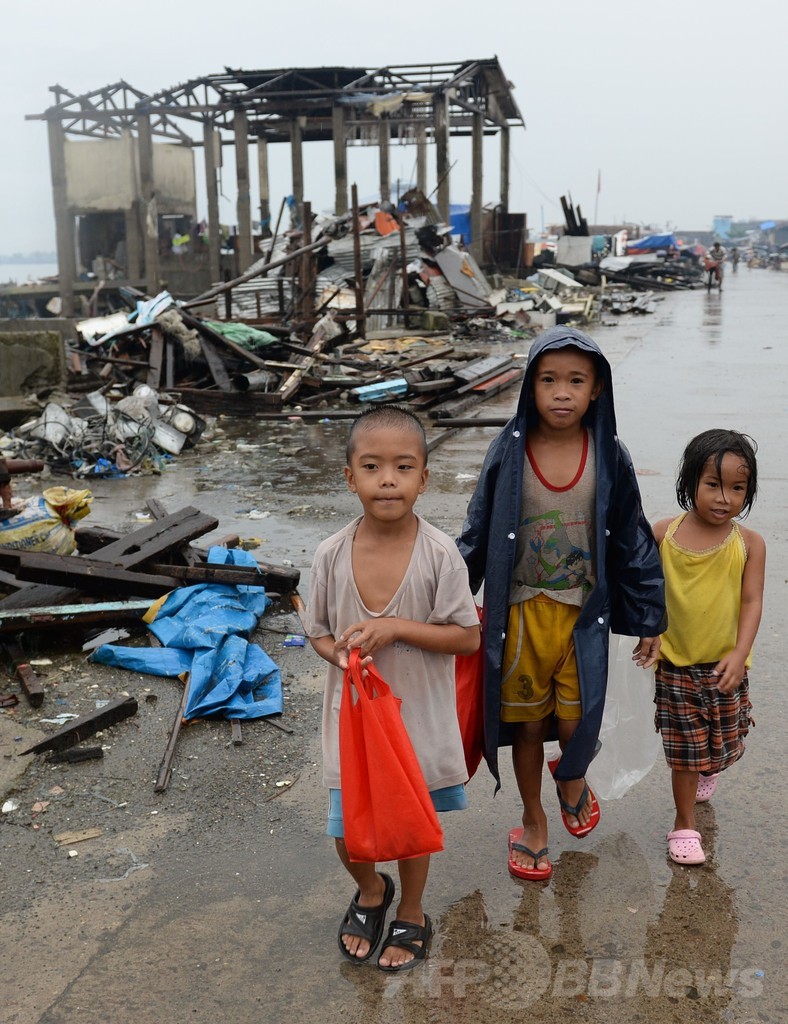 台風30号で壊滅的な被害を受けたレイテ(Leyte)島東部タクロバン(Tacloban)で被災者のために作られた仮設のテント村では、降り続く雨の中、ビニール製のレインコートを着た子どもたちのグループがハロウィーンのようにテントをまわり、出会った人々にキャンディーやコイン、小さなプレゼントなどをねだった。