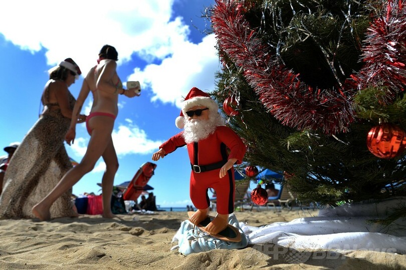 【12月26日 AFP】米ハワイ(Hawaii)州ホノルル(Honolulu)のワイキキビーチ(Waikiki Beach)では25日、明るい日差しの下で南国のクリスマスを楽しむ人たちの姿が見られた。(c)AFP