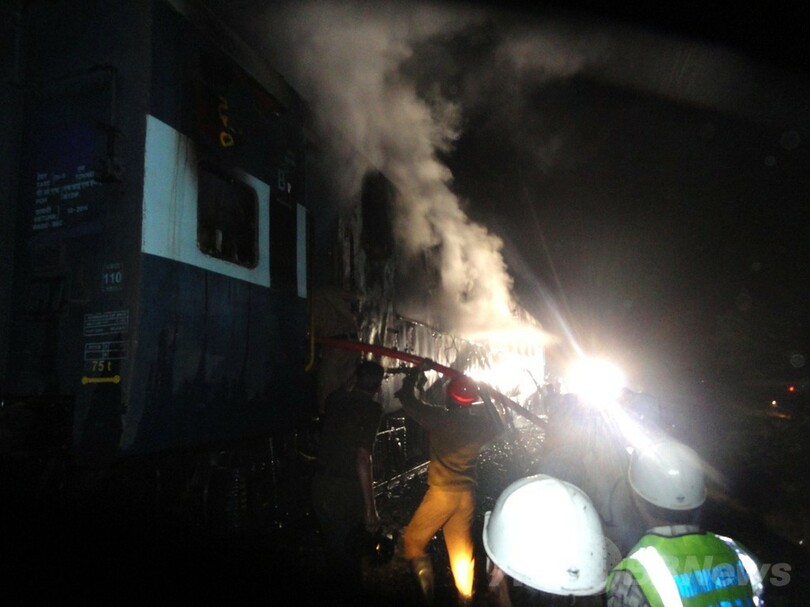 現地の警察幹部が英字紙ザ・ヒンドゥー(The Hindu)に語ったところによると、ナンデードまで1時間ほどのところで運転士が炎に気付き、列車を停止させた。火災発生当時、乗客は眠っていた。テレビの報道によると、出火した客車から逃げた乗客もいたが、多くは煙に巻かれて逃げられなかった。また、死亡者には子供2人も含まれているという。(c)AFP/Bhuvan BAGGA