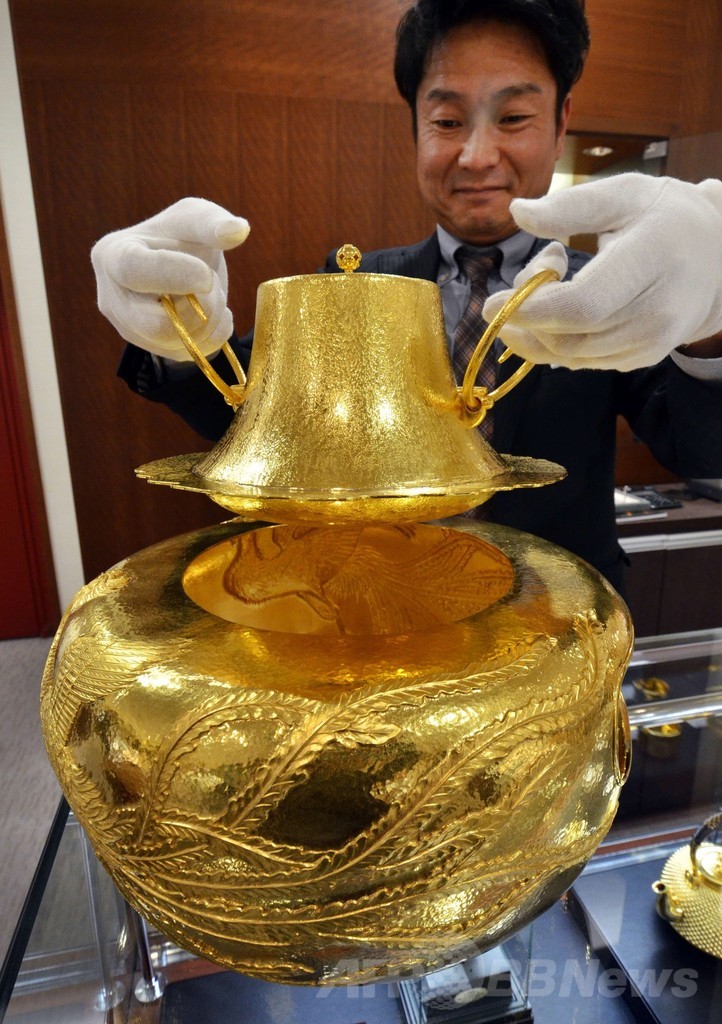 【12月30日 AFP】都内の百貨店松坂屋で30日、新春の初売りで販売される福袋の目玉商品が公開され、来たる2014年を祝って2014万円の値が付けられた11カラットのサファイアの指輪や、19個のサファイアをあしらったネックレス、重さ8.34キロで価格1億円という純金製のやかんがお披露目された。(c)AFP