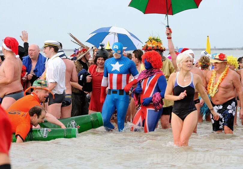 元旦の寒中水泳が50年以上続く伝統行事となっているオランダでは、北海(North Sea)沿岸で多くの大会が開催された。大会主催者によると、ハーグ(Hague)のスヘベニンゲン(Scheveningen)地区のビーチには水着姿の約1万人が集まった。