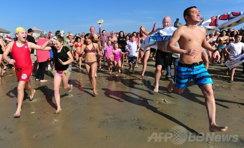 【1月2日 AFP】世界各地のビーチで1日、人々が冷たい海に飛び込んで新年を祝った。