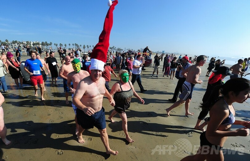 【1月2日 AFP】世界各地のビーチで1日、人々が冷たい海に飛び込んで新年を祝った。