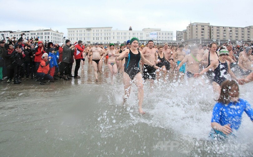 元旦の寒中水泳が50年以上続く伝統行事となっているオランダでは、北海(North Sea)沿岸で多くの大会が開催された。大会主催者によると、ハーグ(Hague)のスヘベニンゲン(Scheveningen)地区のビーチには水着姿の約1万人が集まった。