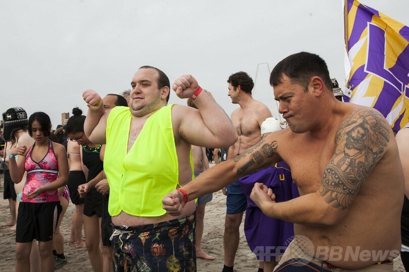 【1月2日 AFP】世界各地のビーチで1日、人々が冷たい海に飛び込んで新年を祝った。