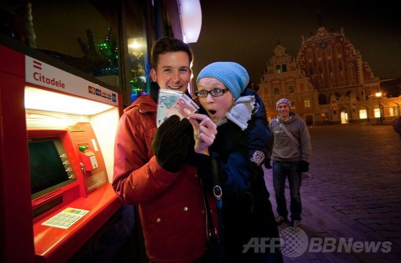しかしながら、緊縮政策を通じて財政赤字を削減し、ユーロ導入に向けての基準をクリアしたラトビアのバルディス・ドムブロフスキス(Valdis Dombrovskis)暫定首相は、ユーロ導入を祝う式典として、現金自動預払機(ATM)から10ユーロの新札を引き出し、ユーロの導入を同国経済にとっての「大きな好機」と評した。(c)AFP/Mike Collier
