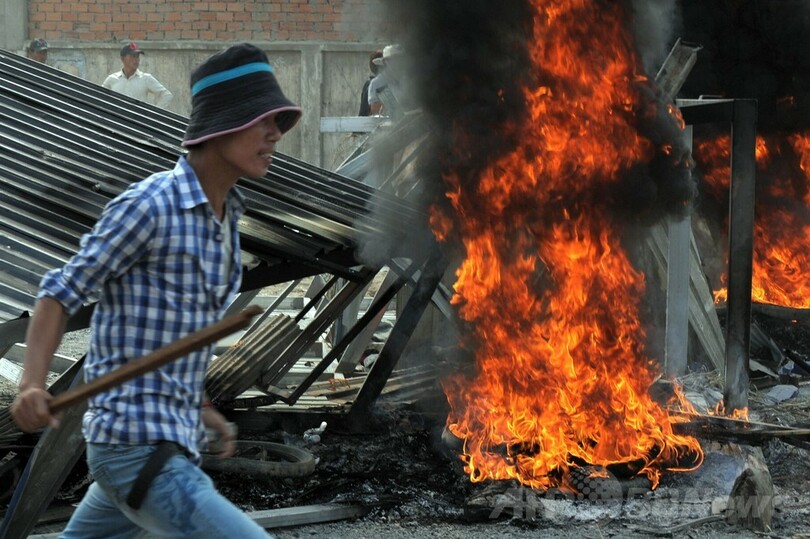 現場で取材中のAFPカメラマンが目撃したところによると、棒や石、火炎瓶などで武装したデモ隊と小銃を所持した警官隊は、工場が集中するプノンペン郊外のベン・スレン(Veng Sreng)地区で衝突。警官隊が空に向けて威嚇射撃した後、デモ隊に向けて発砲した。
