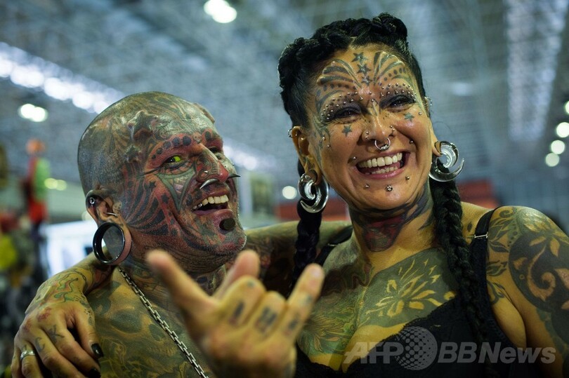 世界で最も多数のタトゥーやピアスを施している夫婦としてギネス世界記録(Guinness World Records)に登録されたタトゥー・アーティストや各国のアーティストたちが参加したほか、タトゥーのコンテストも行われた。(c)AFP