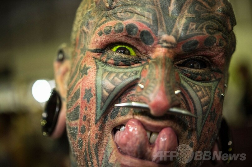 世界で最も多数のタトゥーやピアスを施している夫婦としてギネス世界記録(Guinness World Records)に登録されたタトゥー・アーティストや各国のアーティストたちが参加したほか、タトゥーのコンテストも行われた。(c)AFP