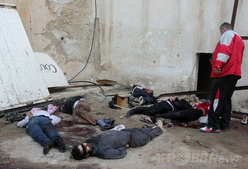 シリア北部アレッポ(Aleppo)にあるイスラム武装組織「イラク・レバント(地中海東岸地域)のイスラム国(Islamic State of Iraq and the Levant、ISIL)」の拠点で、地面に横たわる手錠と目隠しをされた遺体(2014年1月8日撮影)。(c)AFP/MEDO HALAB