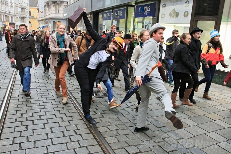 1月7日は「国際シリー・ウォーク・デー(International Silly Walk Day)」。集まったファンたちは、モンティ・パイソンのメンバーが作中で着ていたようなスーツに身を包み、ブルノの街中を思いつく限りの「バカな歩き方」で練り歩いた。(c)AFP