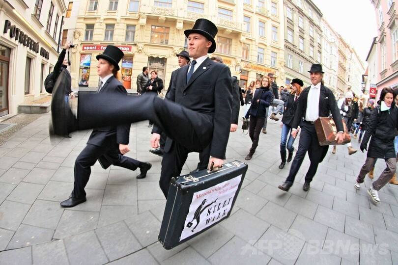 1月7日は「国際シリー・ウォーク・デー(International Silly Walk Day)」。集まったファンたちは、モンティ・パイソンのメンバーが作中で着ていたようなスーツに身を包み、ブルノの街中を思いつく限りの「バカな歩き方」で練り歩いた。(c)AFP