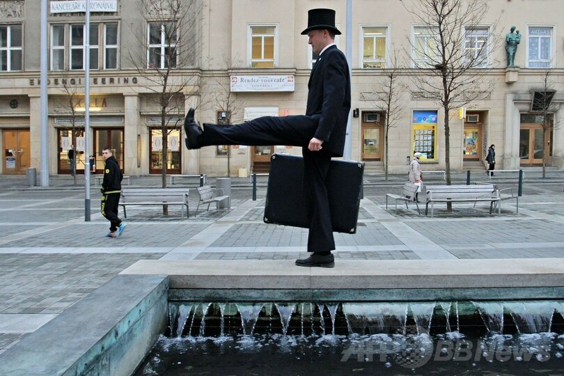 1月7日は「国際シリー・ウォーク・デー(International Silly Walk Day)」。集まったファンたちは、モンティ・パイソンのメンバーが作中で着ていたようなスーツに身を包み、ブルノの街中を思いつく限りの「バカな歩き方」で練り歩いた。(c)AFP
