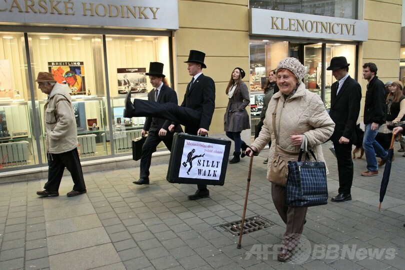 1月7日は「国際シリー・ウォーク・デー(International Silly Walk Day)」。集まったファンたちは、モンティ・パイソンのメンバーが作中で着ていたようなスーツに身を包み、ブルノの街中を思いつく限りの「バカな歩き方」で練り歩いた。(c)AFP