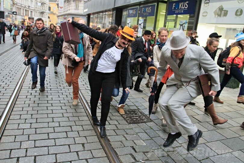 1月7日は「国際シリー・ウォーク・デー(International Silly Walk Day)」。集まったファンたちは、モンティ・パイソンのメンバーが作中で着ていたようなスーツに身を包み、ブルノの街中を思いつく限りの「バカな歩き方」で練り歩いた。(c)AFP