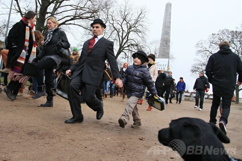 1月7日は「国際シリー・ウォーク・デー(International Silly Walk Day)」。集まったファンたちは、モンティ・パイソンのメンバーが作中で着ていたようなスーツに身を包み、ブルノの街中を思いつく限りの「バカな歩き方」で練り歩いた。(c)AFP