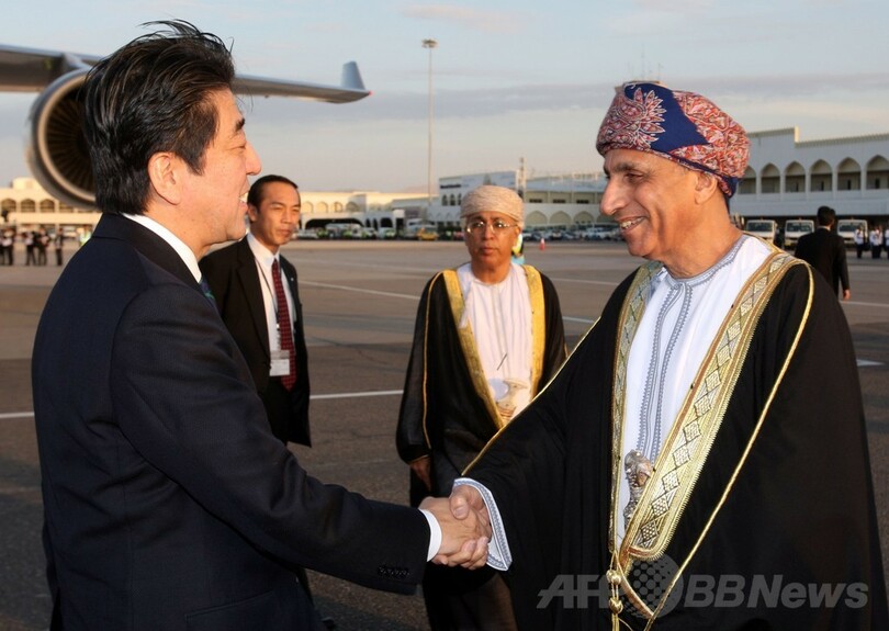 【1月10日 AFP】中東アフリカ4か国歴訪中の安倍晋三(Shinzo Abe)首相は9日、最初の訪問国オマーンに到着し、首都マスカット(Muscat)の空港でファハド・ビン・マハムード・サイド(Fahd bin Mahmud al-Said)閣僚評議会担当副首相の出迎えを受けた。