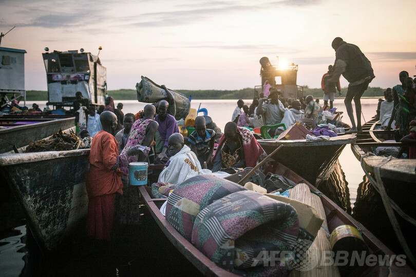 ワニが群がる白ナイル川(White Nile)を挟んでボルの対岸にある湿地ミンカーメン(Minkammen)で取材をしているAFP特派員によると、戦闘から逃れようと数百人が、危険を冒しながら船や徒歩で川を渡っている。ミンカーメンにはすでに8万人近い避難民がおり、戦闘で家を追われた人々が集まる単独では最大の避難場所になっている。(c)AFP/Waakhe Simon Wudu