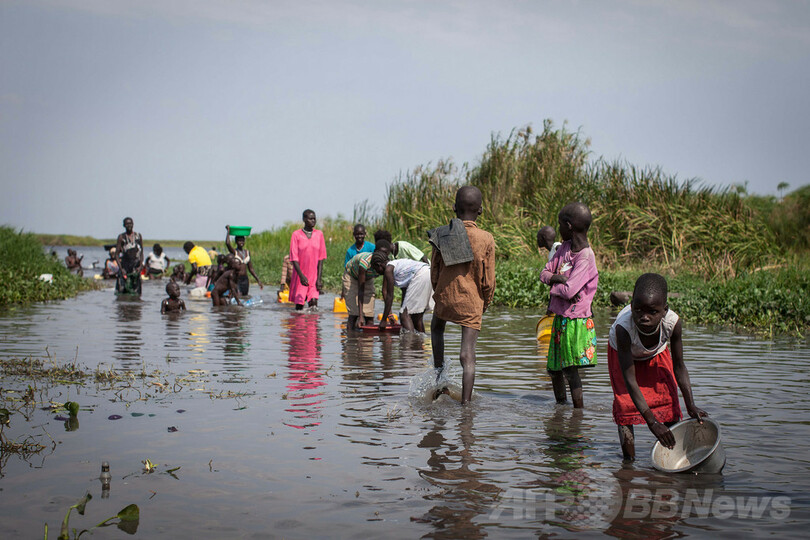 ワニが群がる白ナイル川(White Nile)を挟んでボルの対岸にある湿地ミンカーメン(Minkammen)で取材をしているAFP特派員によると、戦闘から逃れようと数百人が、危険を冒しながら船や徒歩で川を渡っている。ミンカーメンにはすでに8万人近い避難民がおり、戦闘で家を追われた人々が集まる単独では最大の避難場所になっている。(c)AFP/Waakhe Simon Wudu