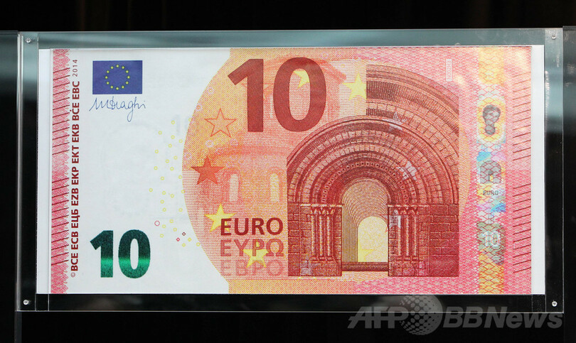 新紙幣のうち、5ユーロ紙幣は既に昨年5月から流通しており、新10ユーロ紙幣はこれに続いて9月23日に発行が始まる。残る20ユーロ、50ユーロ、100ユーロ、200ユーロ、500ユーロも、追って新紙幣が投入される。(c)AFP/Simon MORGAN