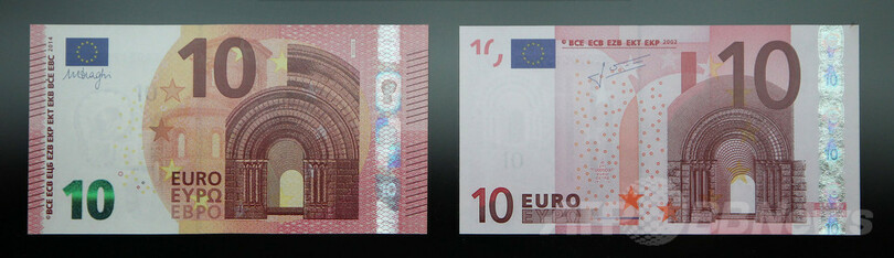 新紙幣のうち、5ユーロ紙幣は既に昨年5月から流通しており、新10ユーロ紙幣はこれに続いて9月23日に発行が始まる。残る20ユーロ、50ユーロ、100ユーロ、200ユーロ、500ユーロも、追って新紙幣が投入される。(c)AFP/Simon MORGAN