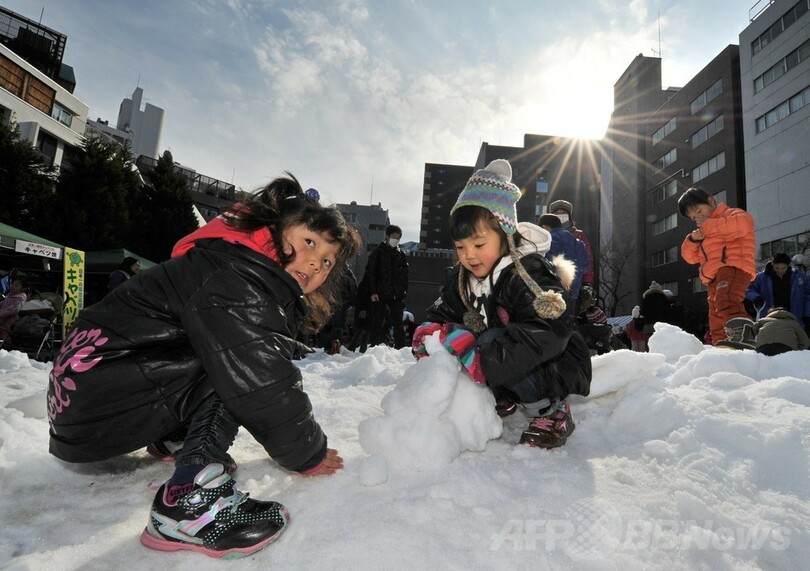 【1月20日 AFP】都心部の神田小川町で18日、毎年恒例の「雪だるまフェア」が開催された。群馬県嬬恋村から運ばれた70トンの雪で雪だるまや雪遊びの広場、滑り台が作られ、集まった子どもたちは沿道に展示されている雪だるまを見たり、雪遊びに興じたりして、雪国気分を楽しんでいた。(c)AFP